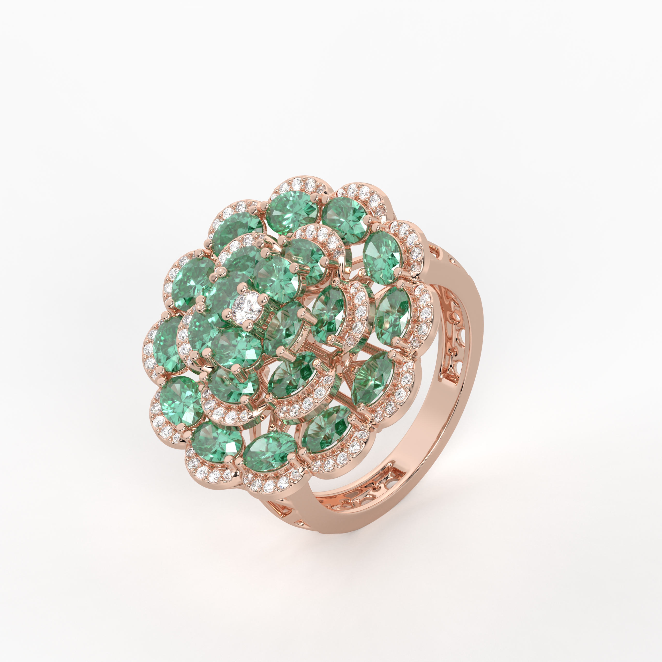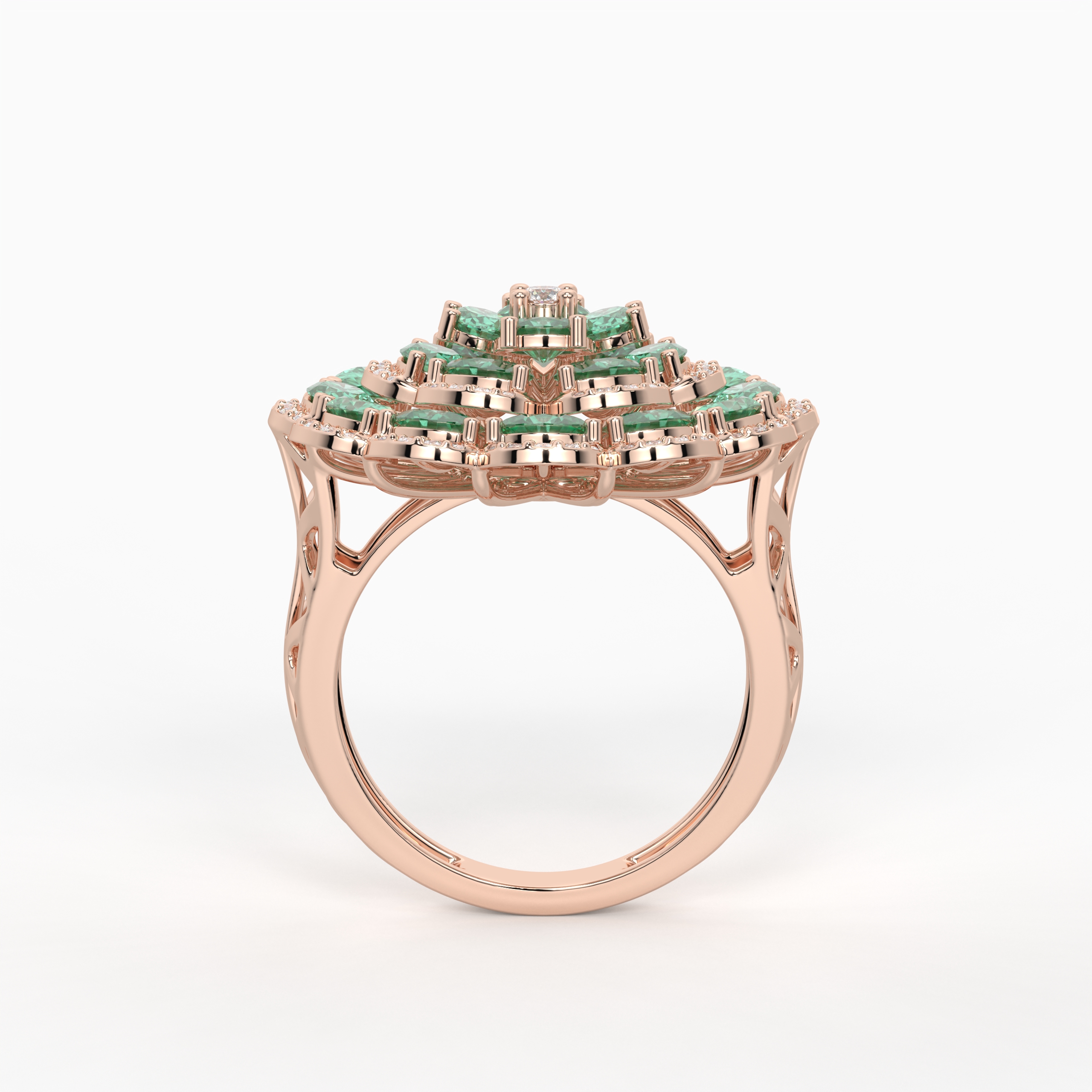 Designed to stand out, this ring highlights a vibrant green stone framed with brilliant-cut diamonds. The diamonds enhance the depth and brilliance of the center gem, adding dimension and glamour. A perfect choice for celebrations, gifting, or adding a pop of color to everyday elegance.