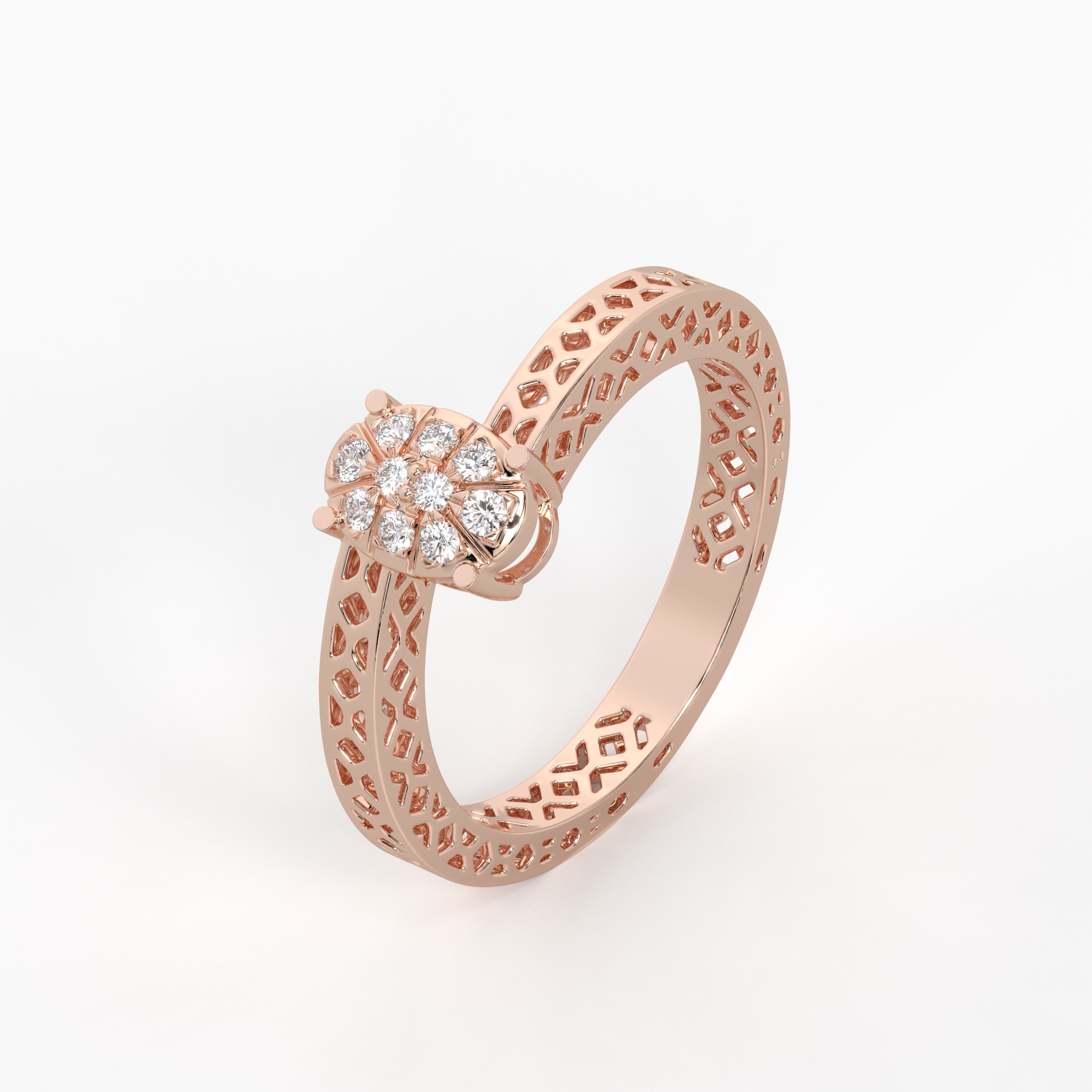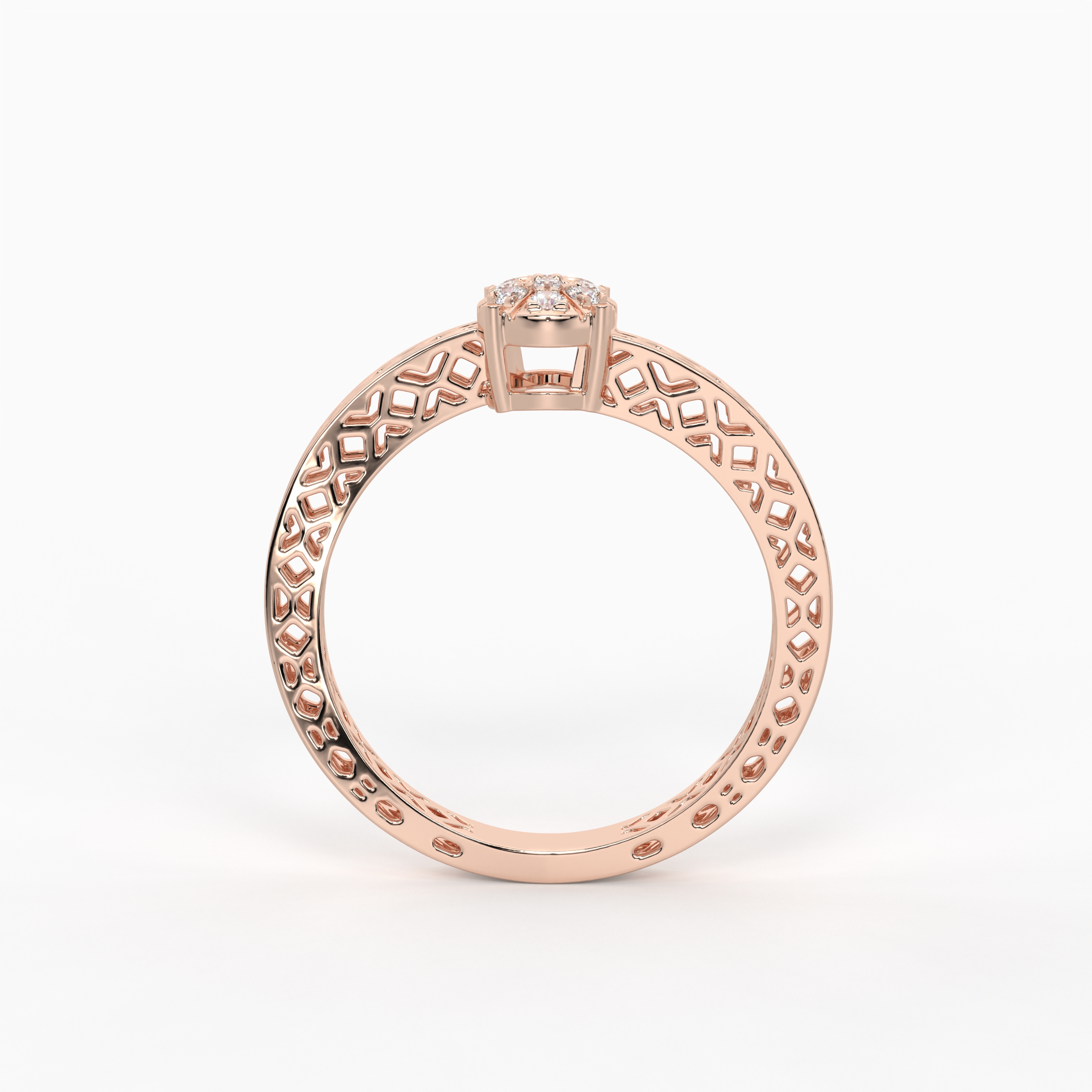 The Noor Heritage Tension Ring highlights a sparkling round diamond seemingly floating above a beautifully patterned jali band. The intricate cutwork enhances airflow and comfort, while the pressure setting maximizes sparkle. A statement piece that celebrates both modern engineering and timeless tradition.
