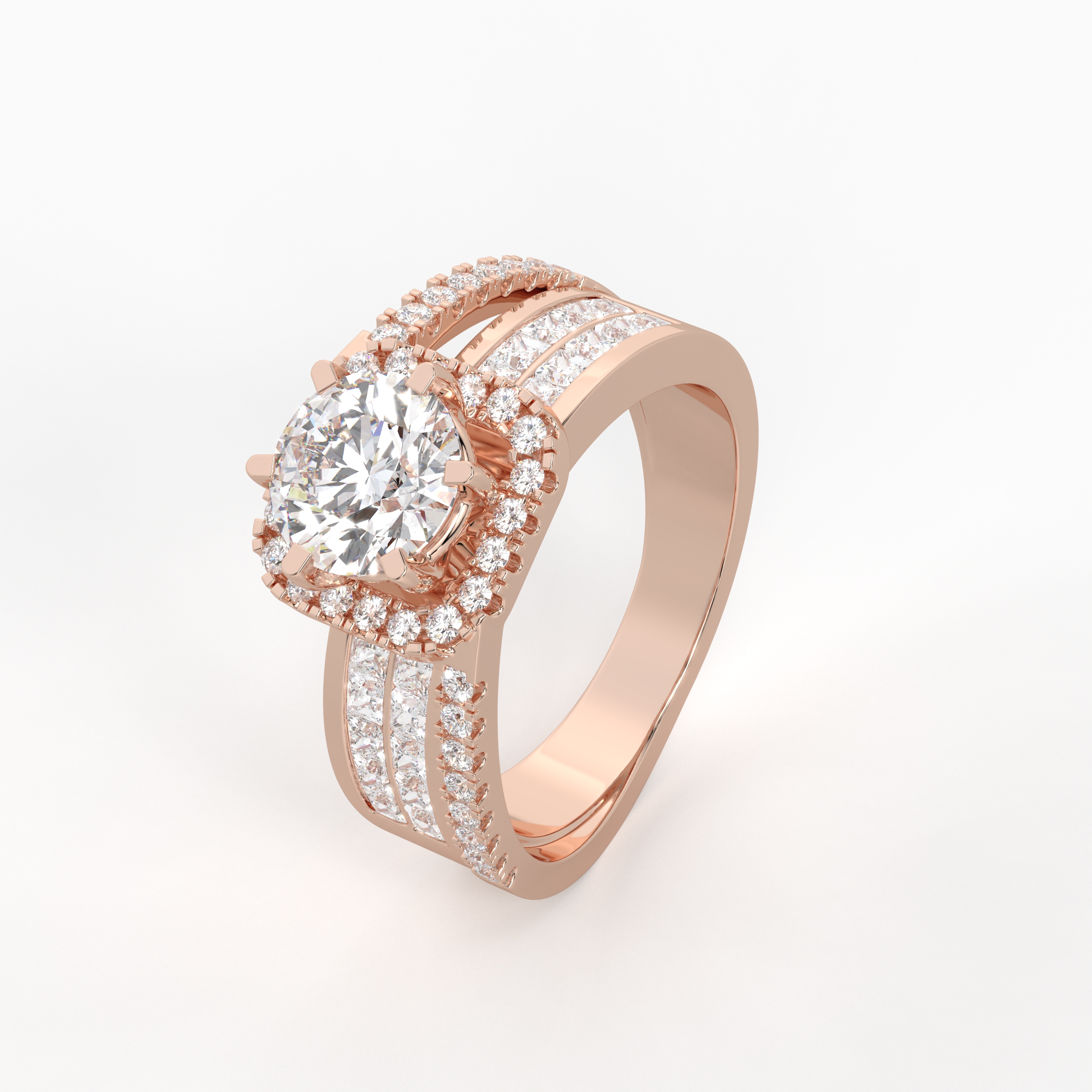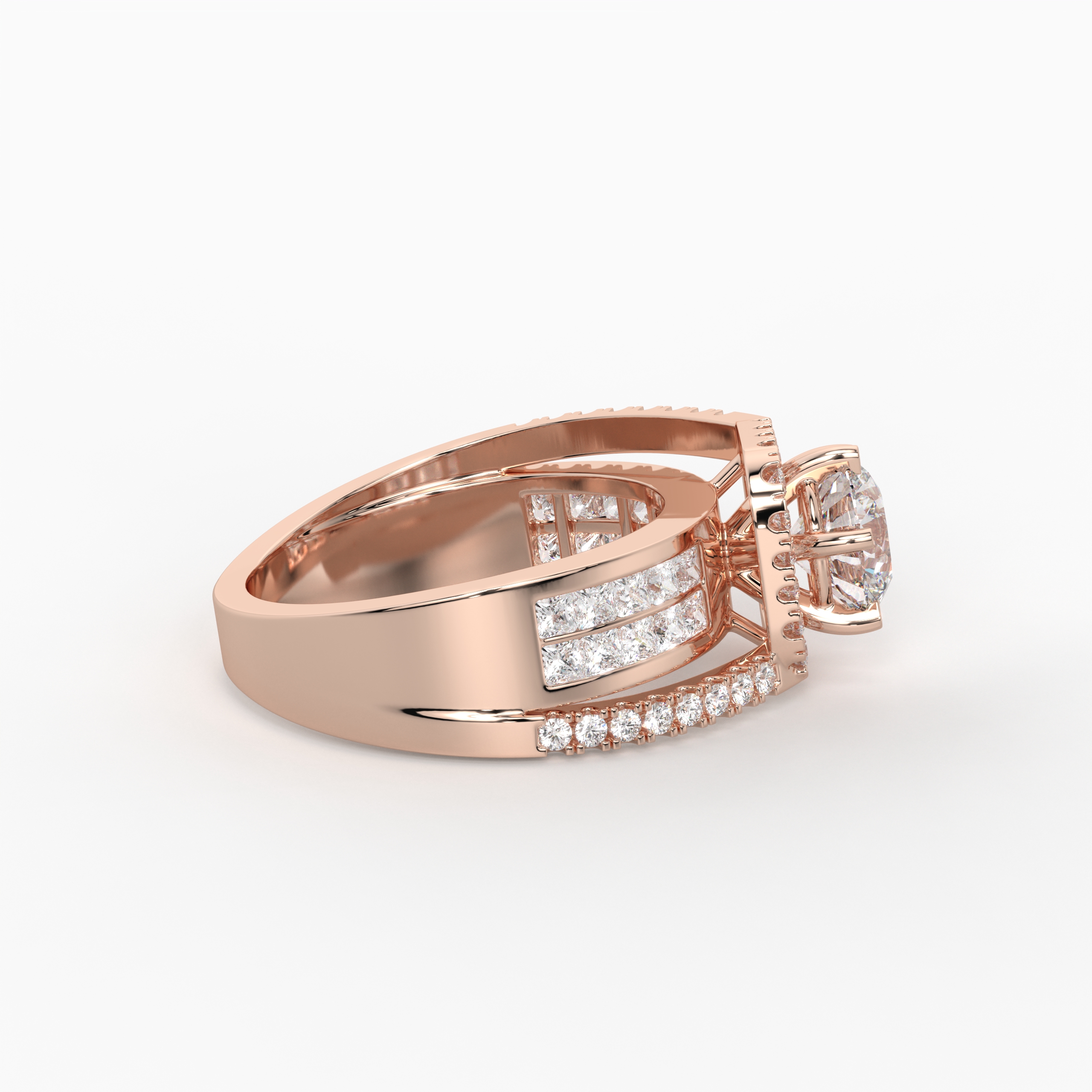 A refined celebration of brilliance, the Majestic Halo Illusion Ring features a radiant round solitaire rising above a flawless panel of princess-cut diamonds set in an invisible setting. The seamless square layout amplifies the center stone’s sparkle, creating depth, dimension, and regal elegance. A perfect choice for engagements and unforgettable moments.