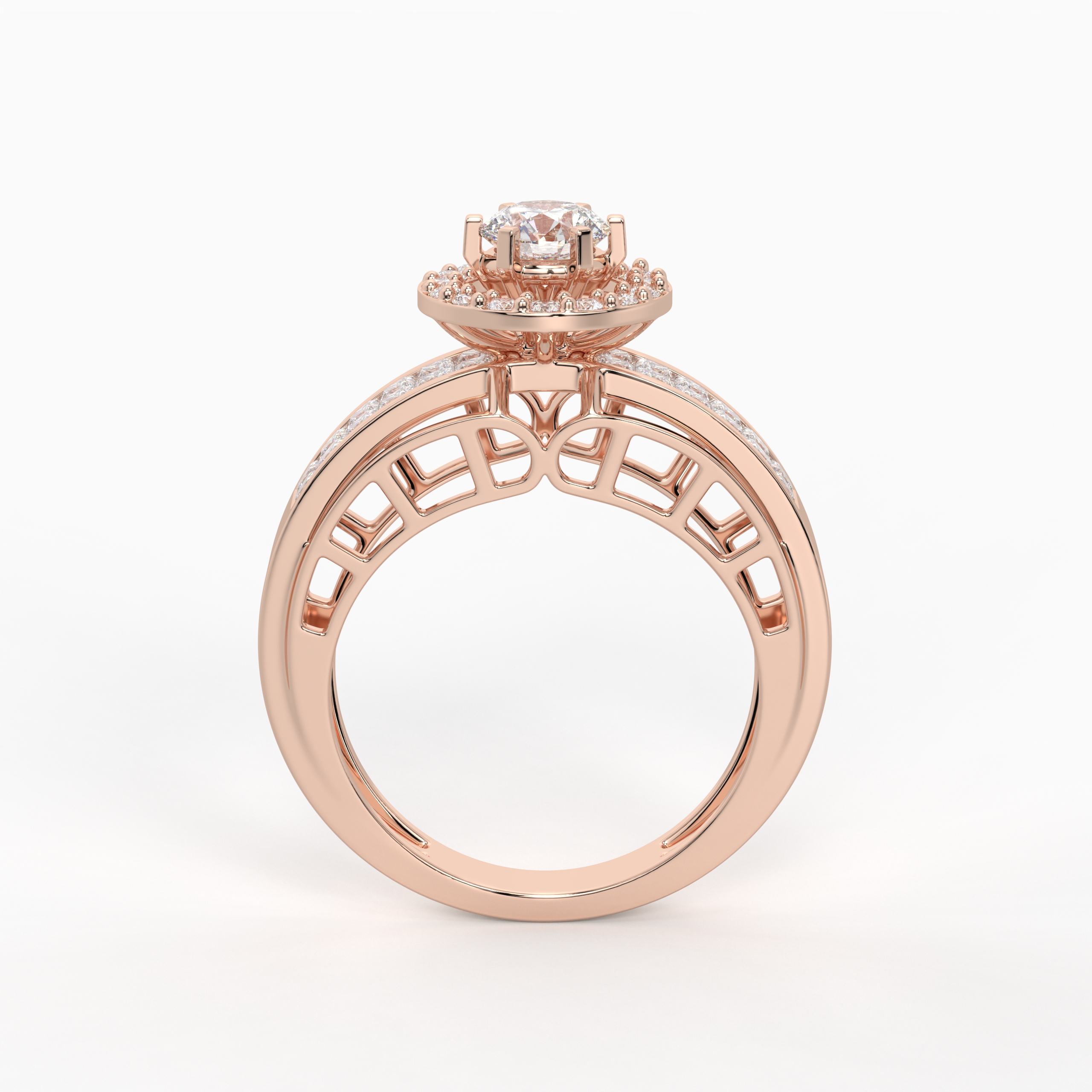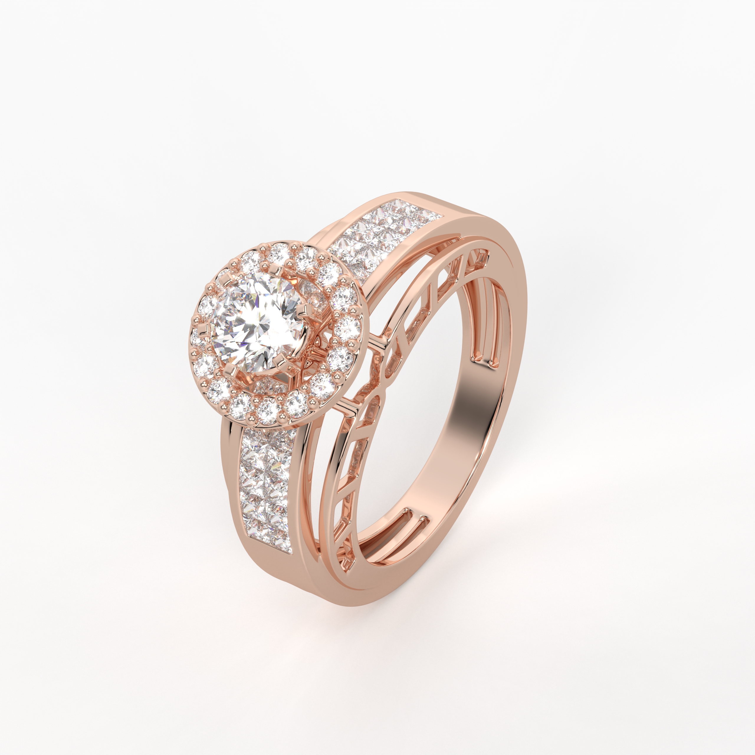 The Celeste Halo Grid Ring highlights a dazzling center solitaire framed by a radiant diamond halo. Along the band, invisibly set princess diamonds form a sleek, uninterrupted sparkle that elevates the design’s luxury appeal. Bold yet refined, this ring is crafted for unforgettable moments.